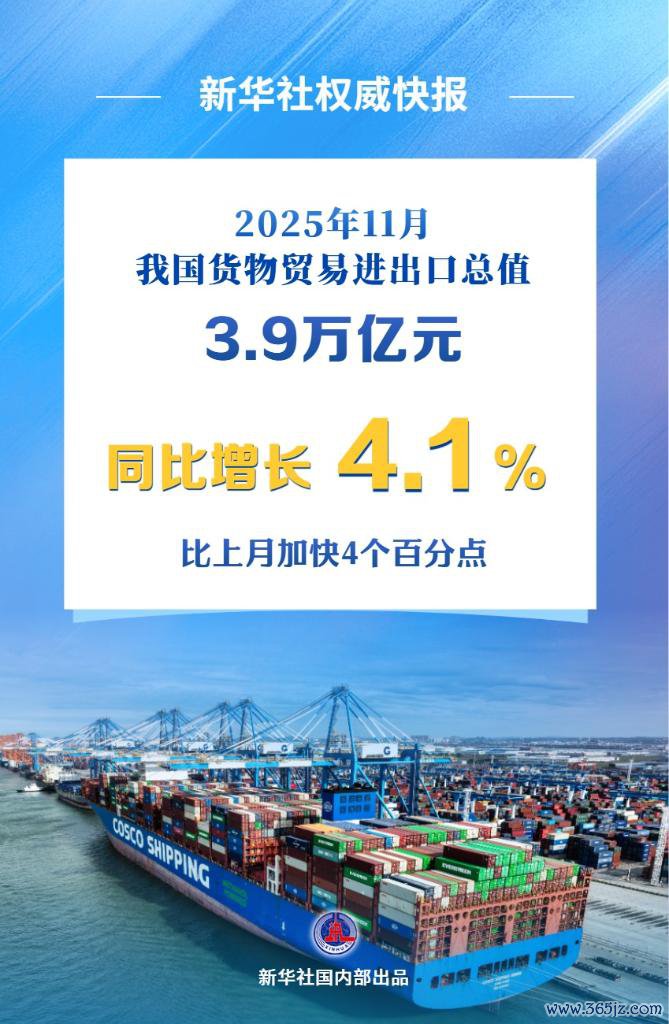 新华社北京12月8日电(记者黄韬铭、邹多为)海关总署12月8日发布数据:本年11月份,我国货品买卖相差口3.9万亿元,同比增速回升至4.1%,从2月起麇集10个月保捏同比增长。